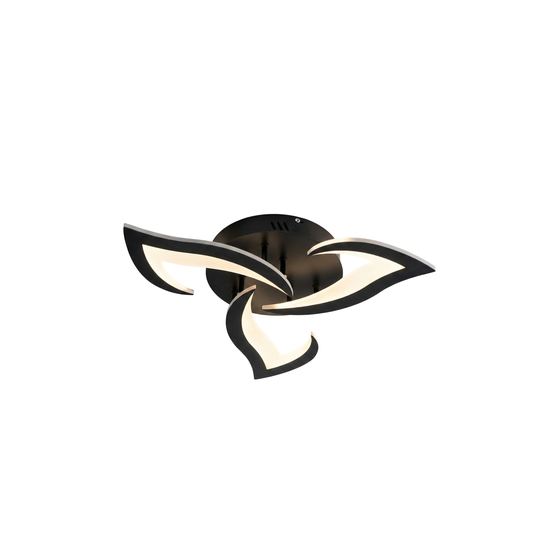 This modern flush-mount ceiling light features three curved arms with integrated LED panels in a matte black finish. This lighting fitting is compatible with 220V electrical systems. It uses integrated LED technology with a fixed color temperature and a power consumption of 35W. The unit is constructed from aluminum and iron with acrylic diffusers for uniform light output. It features a circular central ceiling rose and a low-profile design for low ceilings. Suitable for dry indoor rooms such as lounges or bedrooms. Includes all necessary internal wiring connectors and mounting brackets. Size: 58x58x8cm. This 35W acrylic ceiling light offers lighting adapted to your needs with its three options: warm light (3000K), neutral (4000K) and white (6500K). It is designed for everyday lighting.